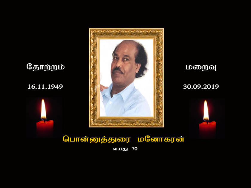 இலங்கை அரியாலையை சேர்ந்தவரும் பிரான்சில் வசித்து வந்தவருமான பொன்னுத்துரை மனோகரன் 30.செப் திங்கட்கிழமை 2019 அன்று காலமானார். இவர் மேரி ஒலிவ் ரூபவதியின் அன்புக் கணவரும் லட்சியா அவர்களின் தந்தையாருமாவார்.
